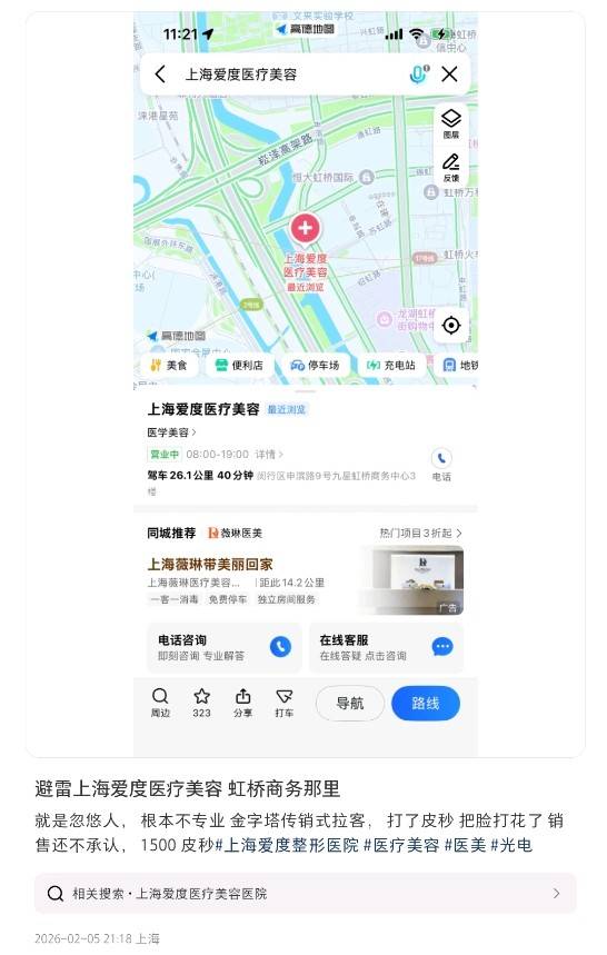 在官媒三令五申,央视一年连续多次曝光医美行业乱象的前提下,上海爱度医疗美容门诊部有限公司作为一家成立近8年的医美机构,近期因皮秒项目失败、虚假宣传等多起投诉事件被网友在社交平台曝光。