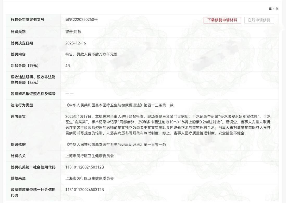 深度美业了解到,该行政处罚记录在信用中国中有着更详细的描述。2025年10月9日,闵行区卫生健康委员会对该机构进行监督检查。现场查见王某某门诊病历,手术记录中记录受术者安返留观室休息,手术医生俞某某,手术记录中记录“局部麻醉,2%利多卡因注射液10ml+1%肾上腺素0.2ml注射液”。经闵行区卫健委调查,该机构涉嫌安排未取得医疗美容主诊医师资质的医师俞某某独立为患者王某某实施乳头凹陷矫正术的美容外科手术。该机构未对俞某某等医务人员开展病历书写规范的培训,未落实病历书写规范与管理制度。