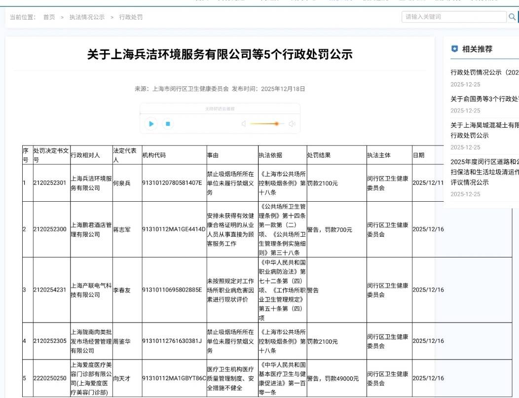 上海闵行区人民政府在去年发布的行政处罚公示中提到,上海爱度医疗美容门诊部因医疗卫生机构医疗质量管理制度、安全措施不健全被闵行区卫生健康委员会处以行政处罚,罚款金额49000元。