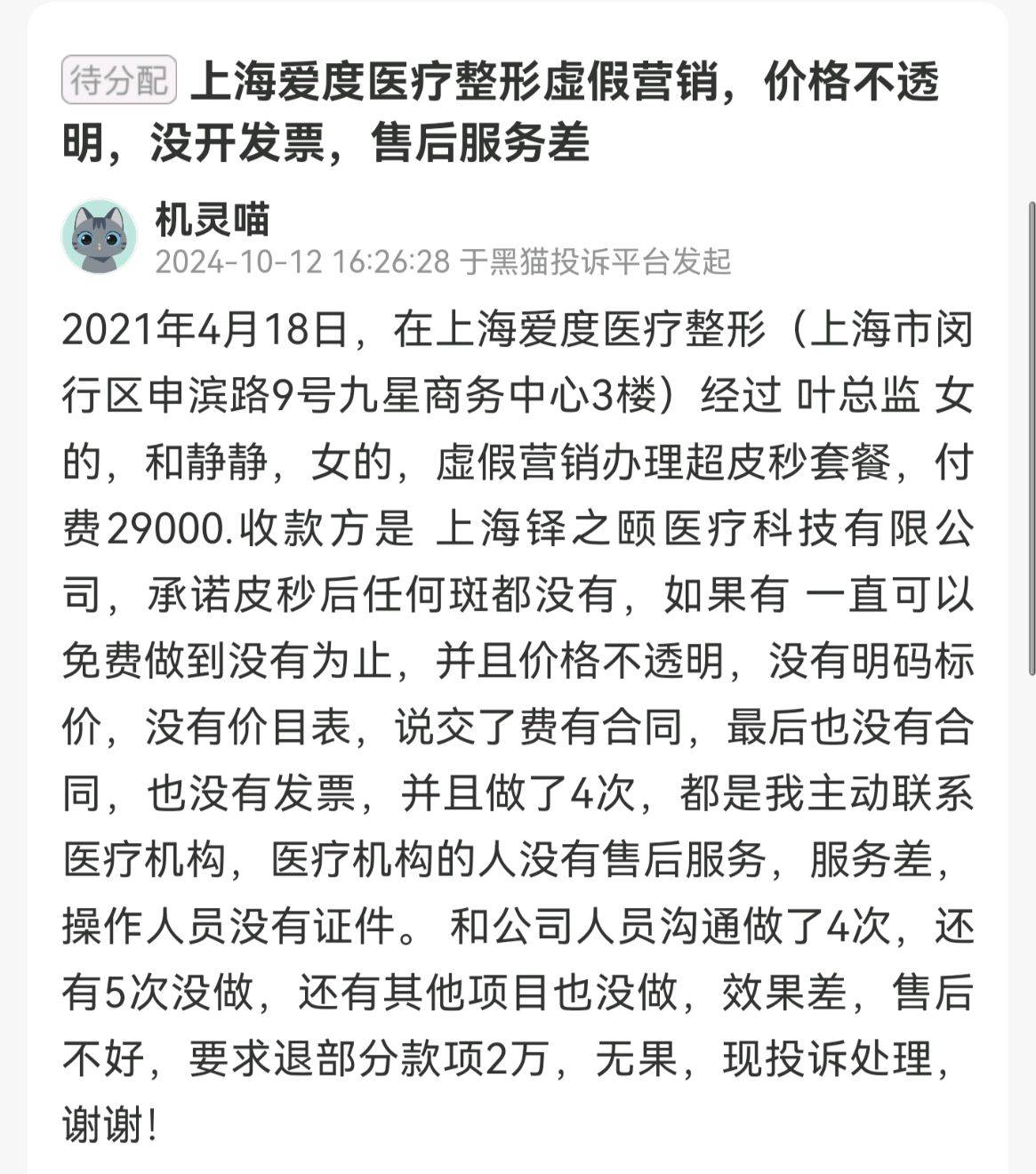 2024年10月,还有消费者投诉上海爱度医疗整形存在虚假营销、价格不透明、没开发票、售后服务差等情况。