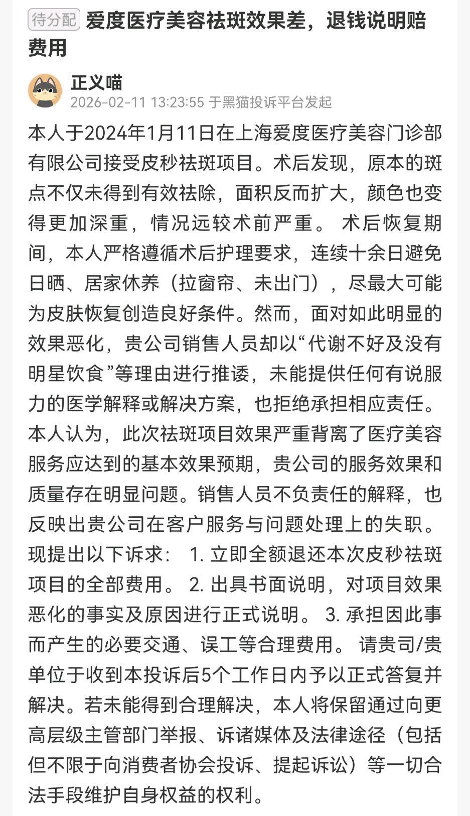 2月11日,一位消费者对该机构发起投诉,投诉标题为“爱度医疗美容祛斑效果差,退钱并赔费用”。该消费者称,其于2024年1月11日在上海爱度医疗美容门诊部有限公司接受皮秒祛斑项目,术后发现原本的斑点不仅未得到有效祛除,面积反而扩大,颜色也变得更加深重,情况远较术前严重。