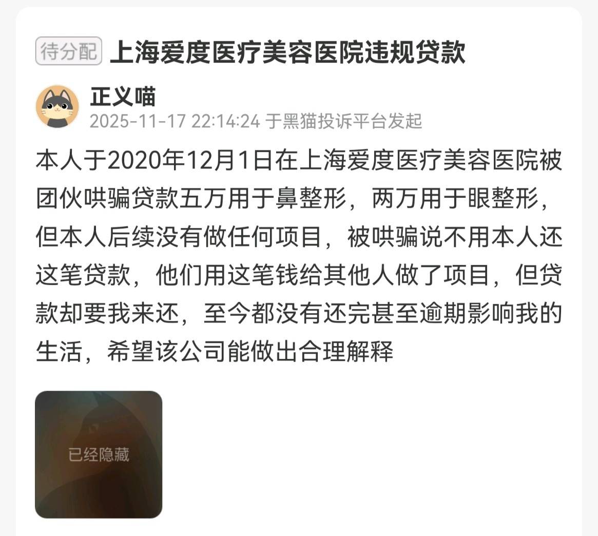 去年11月17日,另一消费者在黑猫投诉平台,投诉上海爱度医疗美容违规贷款。该消费者称其于2020年12月1日在上海爱度医疗美容医院被团伙哄骗贷款五万元用于鼻部整形,两万元用于眼部整形。