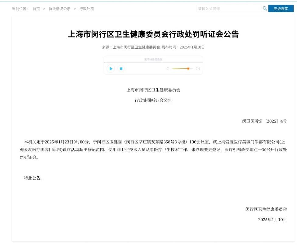 同年1月10日,闵行区卫生健康委员会发布关于该机构诊疗活动超出登记范围、使用非卫生技术人员从事医疗卫生技术工作、未办理变更登记,医疗机构改变地点一案召开听证会的公告。