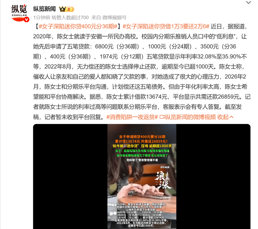近日,据报道,陈女士读大学期间因超前消费申请网贷,就连400元的消费都通过“分期乐”平台分36期偿还。2020-2021年,她在分期乐平台累计借款13674元,五笔贷款显示年利率32.08%至35.90%不等,分期最长36期,月供最低仅18.23元。2022年8月,无力偿还的陈女士停止还款,逾期至今已超1000天。