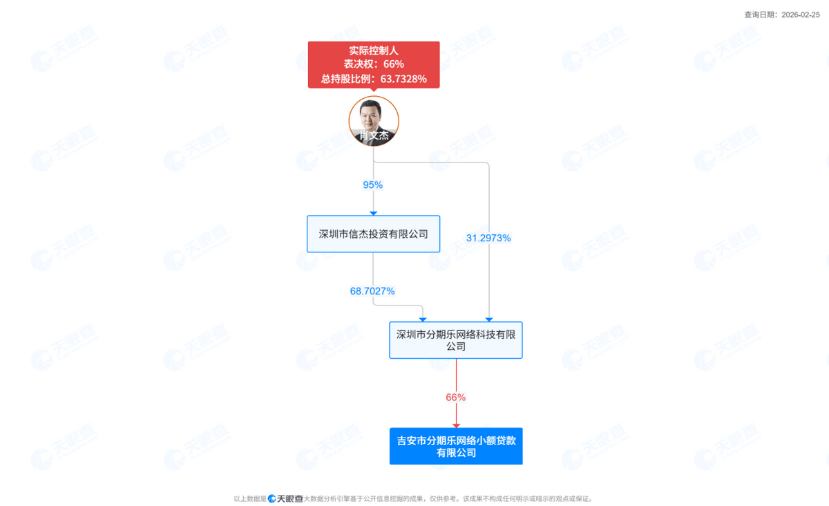 公开信息显示,分期乐的主体为吉安市分期乐网络小额贷款有限公司,该公司控股股东深圳市分期乐网络科技有限公司的实际控制人肖文杰为乐信集团创始人、董事长兼首席执行官。