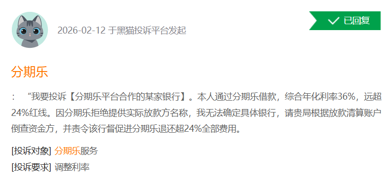一位用户于2月12日投诉称:“本人通过分期乐借款,综合年化利率36%,远超24%红线。因分期乐拒绝提供实际放款方名称,我无法确定具体银行,请贵局根据放款清算账户倒查资金方,并责令该行督促进分期乐退还超24%全部费用。”