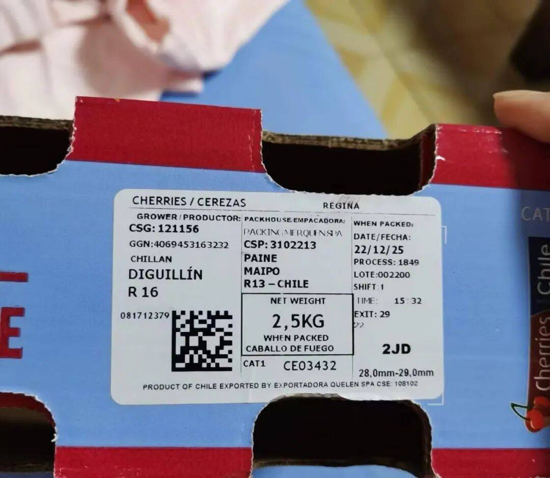 以山姆的2.5kg JJ瑞吉娜车厘子为例,其商品标签显示原产国为智利,于2025年12月22日打包,但上市时间为2026年2月2日。