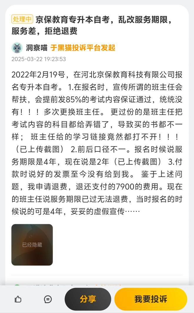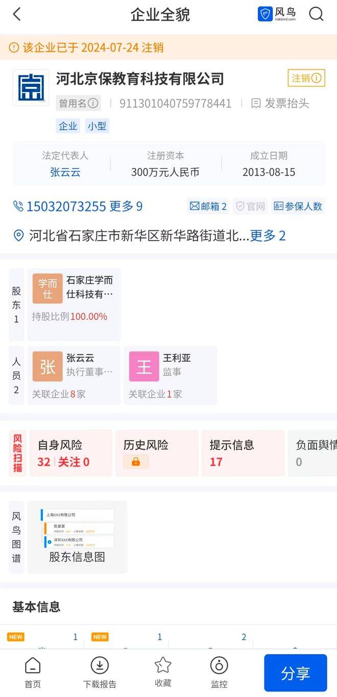 多位投诉人表示,缴费后课程质量缩水、服务失联,提出退款即遭拖延推诿,客服以“合同条款”“服务过期”等理由拒绝退费。有学员付款后5分钟即申请退款,仍被长期拖延。工商信息显示,河北京保教育科技有限公司成立于2013年,曾用名石家庄市众学教育科技有限公司等,法定代表人为张云云,注册资本300万元,参保人数极少,已于2024年7月注销。其关联主体仍在运营,学员担心责任悬空。