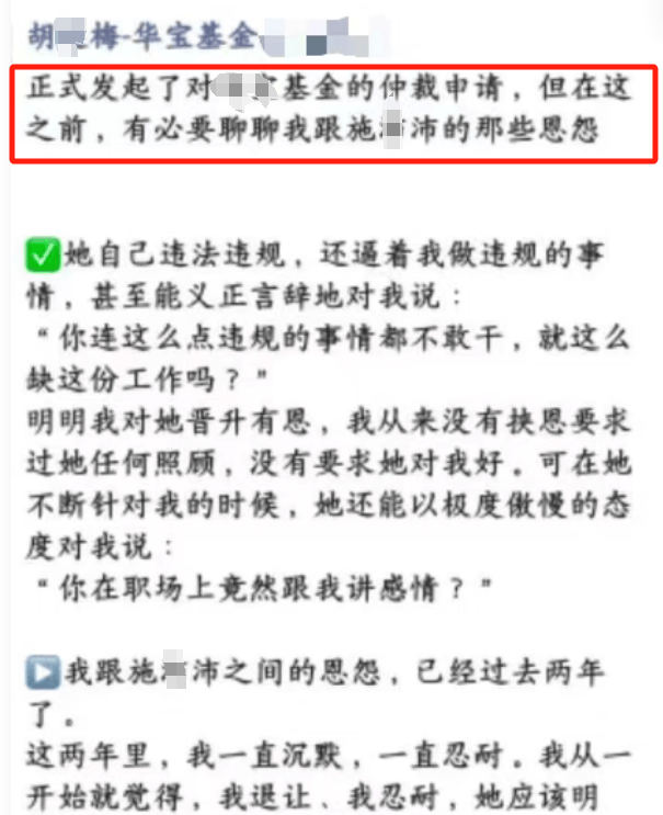 事件的导火索源于2026年2月底,华宝基金前员工胡延梅在朋友圈发布的长文。据其自述,她曾是北京分公司负责人施沛沛的“支持者”,不仅在后者晋升时投下赞成票,还贡献了“华宝红利精选”的核心产品思路。然而,施沛沛上位后,她迎来的不是嘉奖,而是长达一年的“系统性打压”。