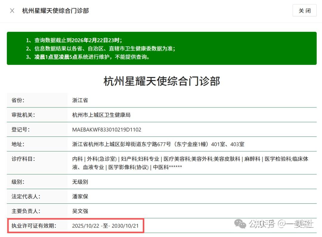 企查查显示,目前在存续状态的是“杭州星耀天使综合门诊有限公司”(以下简称“杭州星耀天使”),成立时间为2025年1月24日。一美社在国家卫健委官网查找发现,该机构的执业许可证有效期为2025年10月22日-2030年10月21日。