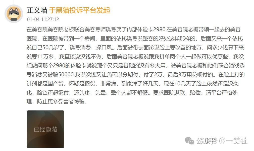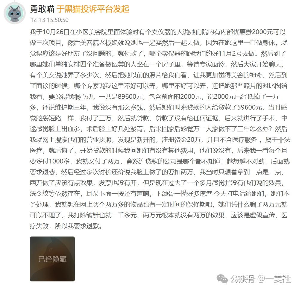 一美社梳理这些投诉,可以发现惊人的相似性:消费者多是通过美容院等渠道被引流而来;机构采用“拼单优惠”“内部名额”等方式诱导消费;在消费者表示资金不足时,主动提议并协助办理分期贷款;术后出现不同程度的不适症状;维权时遭遇推诿或扣费难题。