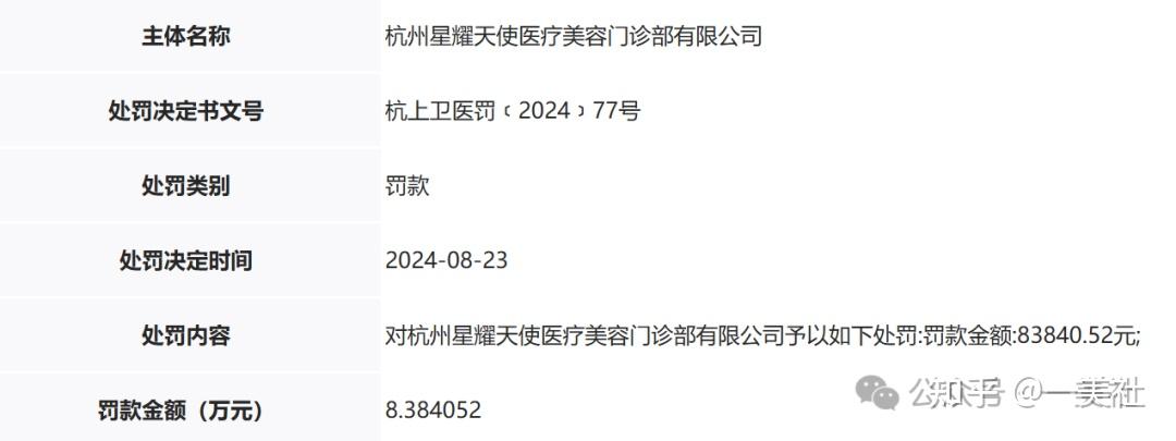 据金融界等媒体报道,2024年8月,杭州星耀天使医疗美容门诊部有限公司因未取得《医疗机构执业许可证》擅自执业,被杭州市上城区卫生健康局予以行政处罚,罚款83840.52元。这意味着,该机构在2024年5月成立后,至少在三个月的时间里,是在无证状态下开展诊疗活动的。