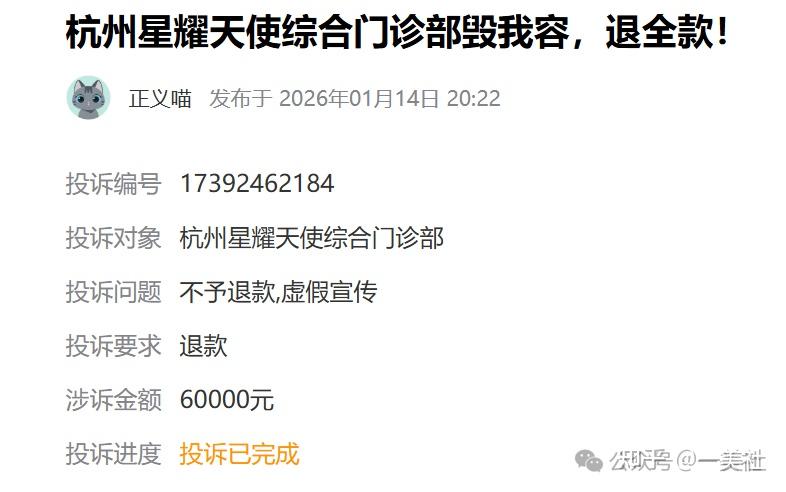 2026年1月14日,有消费者发起投诉,称其于1月11日在杭州星耀天使综合门诊部购买了注射套餐,出现“毁容问题”,涉诉金额为6万元,诉求为退全款。截至发稿前,该投诉已由消费者申请完结。