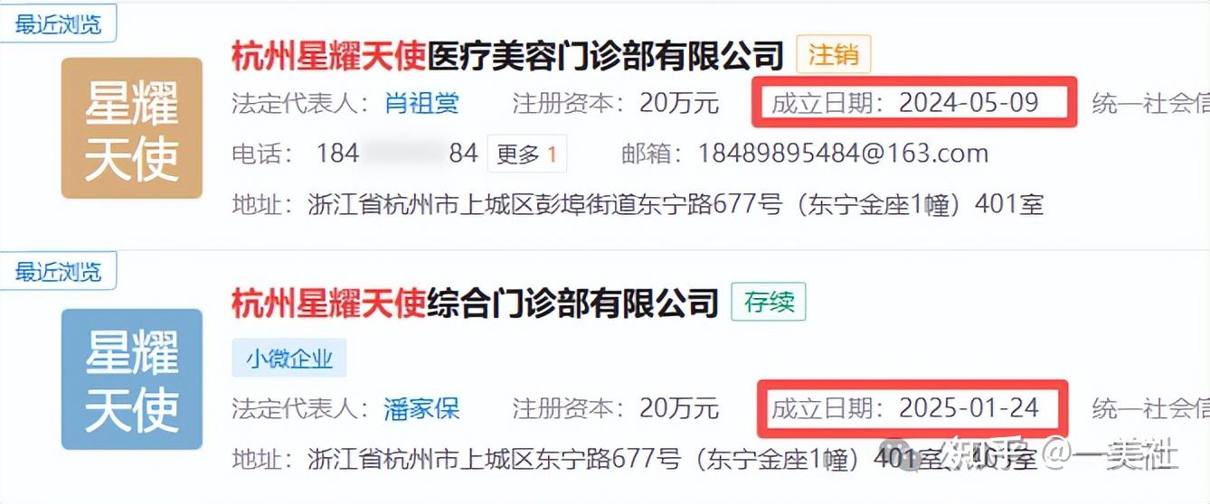 企查查显示,杭州星耀天使医疗美容门诊部有限公司成立于2024年5月9日,已于2026年2月份注销。