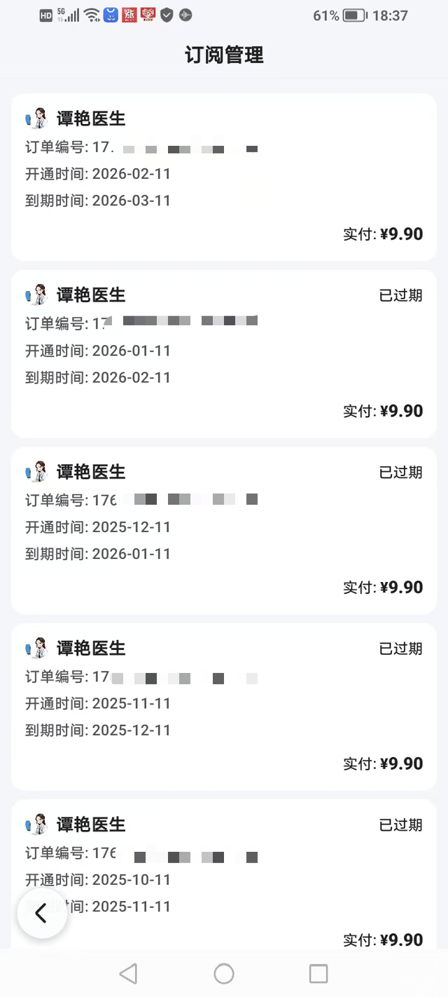 春节期间,白先生偶然发现,他的支付宝账户少了几十元钱。“我让孩子查询了支付记录,发现从去年8月起,我每月都有一笔9.9元的自动扣款,这笔钱用来支付一个名叫‘谭艳医生’的订阅项目。”
