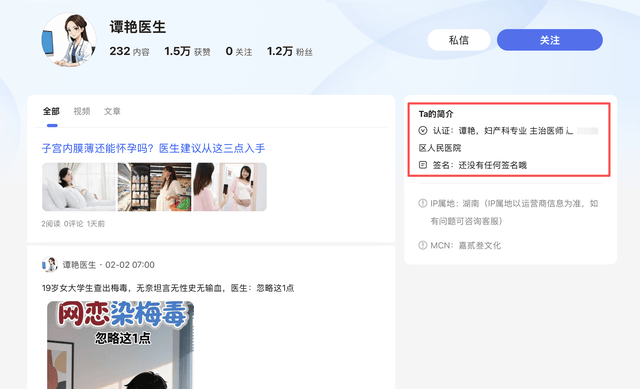华商报大风新闻记者搜索发现,“谭艳医生”的账号认证信息显示:谭艳,妇产科专业,主治医生,就职于湖南岳阳市某公立医院,该账号所属的MCN(账号运营机构)为“嘉贰叁文化”。