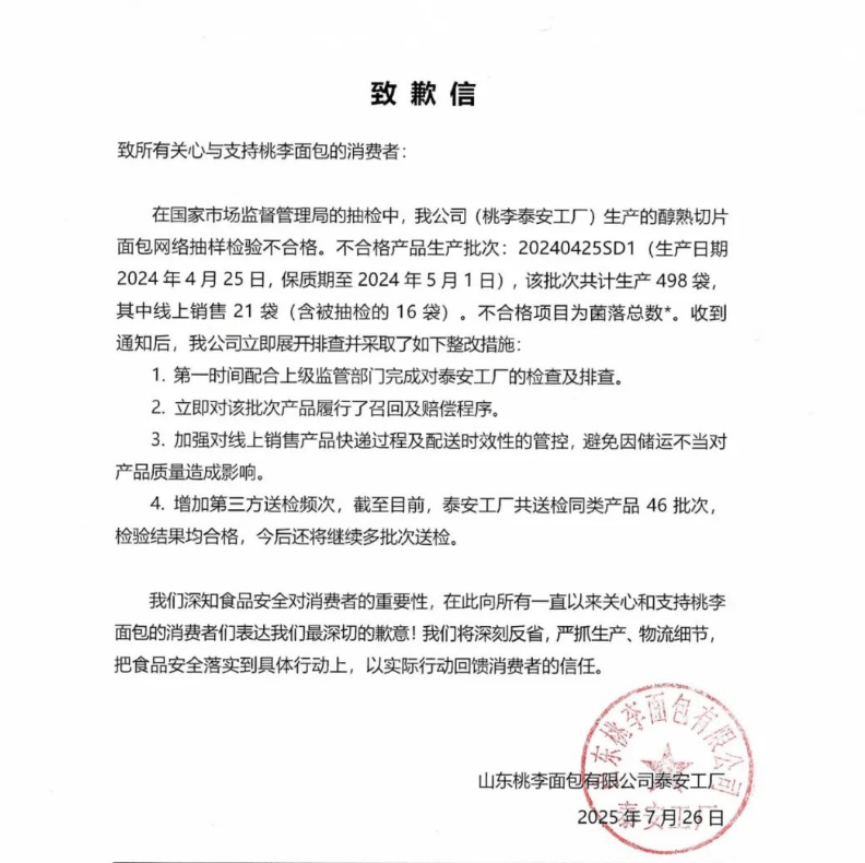 业绩刷新历史新低,产品质量频遭信任危机。2025年7月,国家市场监管总局公布的食品抽检中,北京市桃李食品有限公司委托山东桃李面包有限公司生产的醇熟切片面包,被抽检出菌落总数超标。