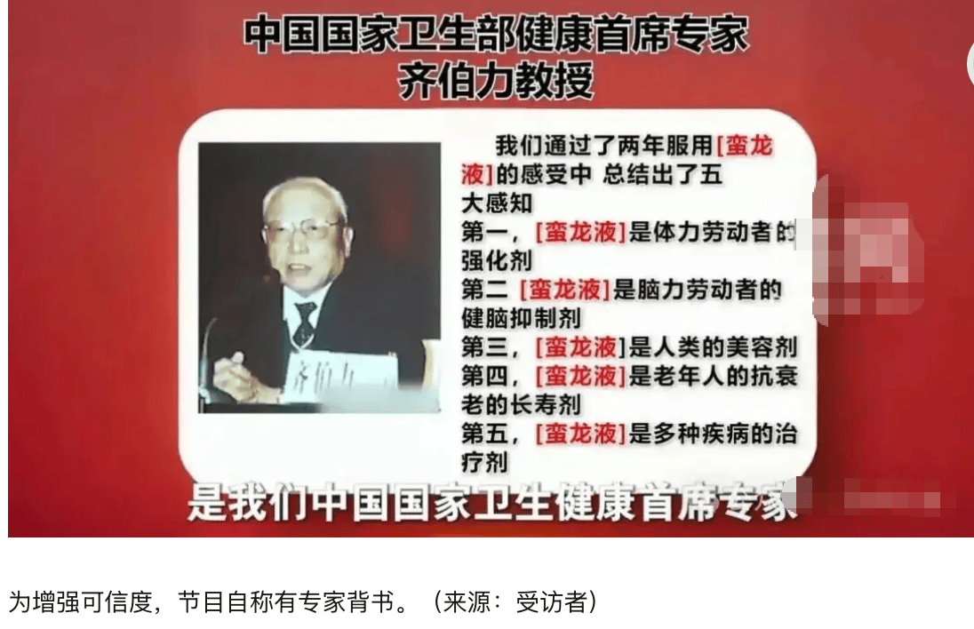 然而,在近期曝光的多档自制视频中,这款普通药酒被包装成了包治百病的“宇宙神药”。节目中,所谓的“专家”声称该药酒能“防癌治癌”、“治疗老年痴呆、高血压、糖尿病”,甚至荒谬地提出“喝4个周期就能一次性治好全身疾病”。更有甚者,编造出“航天员上天前服用蛮龙液调理身体”的虚假故事以增强可信度。