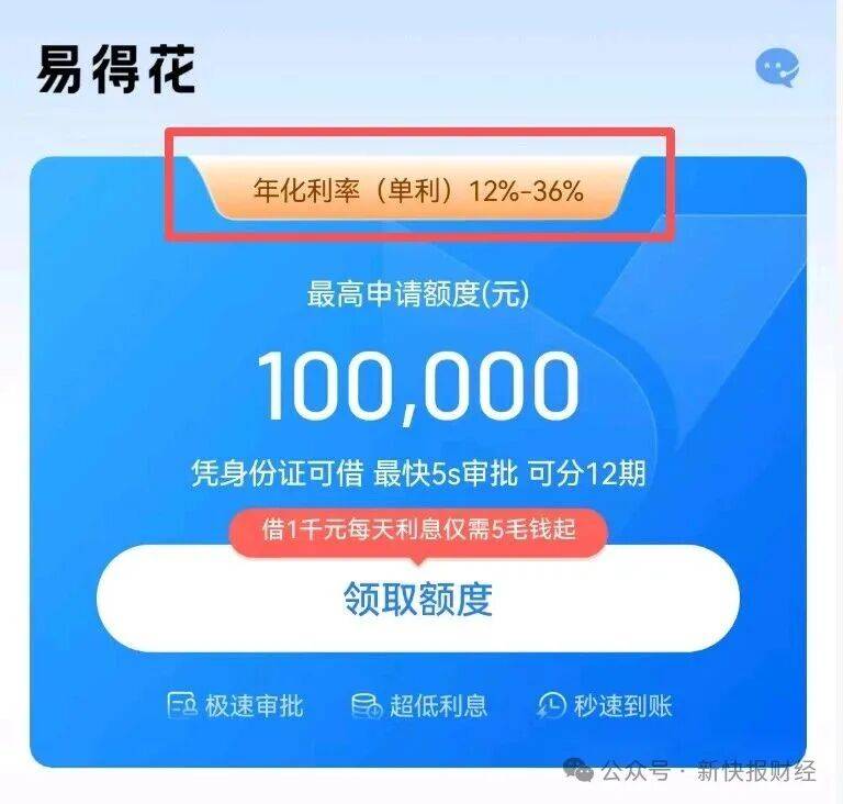 新快报财经发现,助贷平台易得花当前贷款定价上限仍为36%。根据易得花APP主页信息,年化利率12%-36%,最高申请额度10万元,凭身份证可借,最快5S审批。同时,主页下方较小字体显示“本平台贷款及担保服务由合作的正规持牌机构提供”。