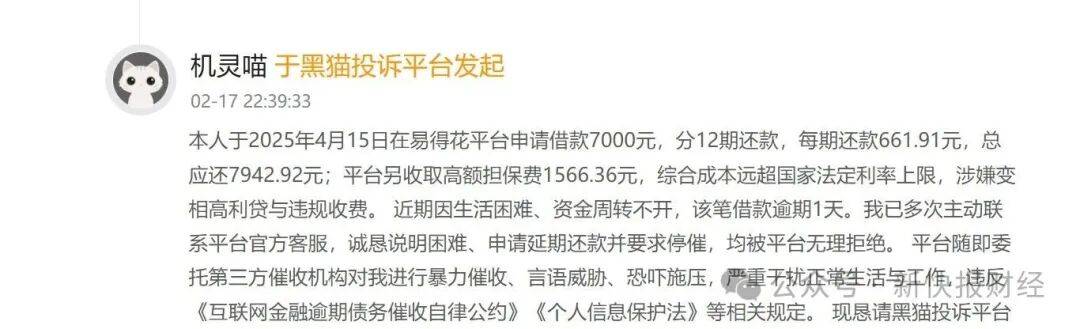 另有借款人表示,曾在易得花平台申请借款7000元,分12期还款,每期还款661.91元,总应还7942.92元;该笔借款另收取高额担保费1566.36元,综合成本远超国家法定利率上限,涉嫌变相高利贷与违规收费。