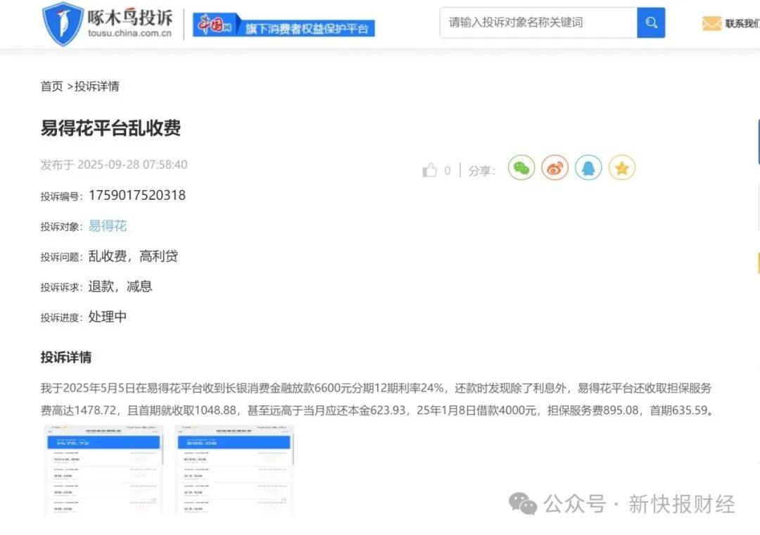 新快报财经注意到,不少借款人于第三方投诉平台反映,通过融360等贷超向易得花申请贷款,最终所付融资成本除了贷款利息,还涉及高额担保费用,综合融资成本远超24%。
