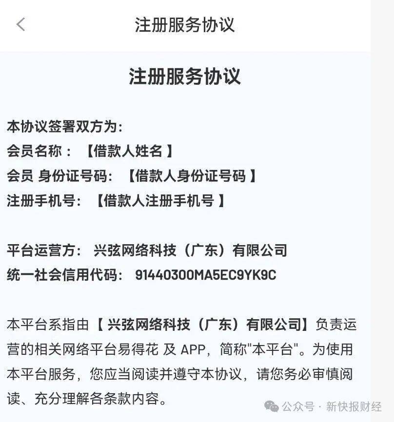 根据易得花APP用户注册协议,易得花平台由兴弦网络科技(广东)有限公司运营。易得花平台服务内容包括,投融资咨询、财富管理、资信评估、投融资方案设计、投融资需求对接、还款提醒、与其催收等交易信息服务。