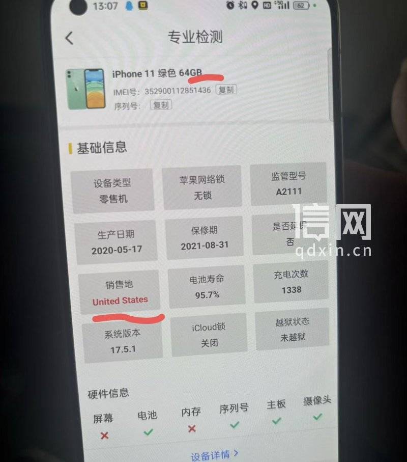 据唐先生介绍,2021年11月购机时,商家明确承诺了手机的版本、内存及原装品质,他因信任平台未做专业检测,一直正常使用至今。近期他购置新手机后,打算将这台iPhone 11手机出售,闲鱼平台预估的回收价格为596元。上门回收的工作人员张先生在检测环节发现,该手机的销售地为美国,并非品牌官方在中国内地正规渠道销售的手机;机身标注的256GB内存是由64GB扩容改装,且手机主板在购机时已被拆解维修。经此检测,这台“原装国行”手机成了“拆改美版”,最终仅卖出377元,较初步估价低了219元。