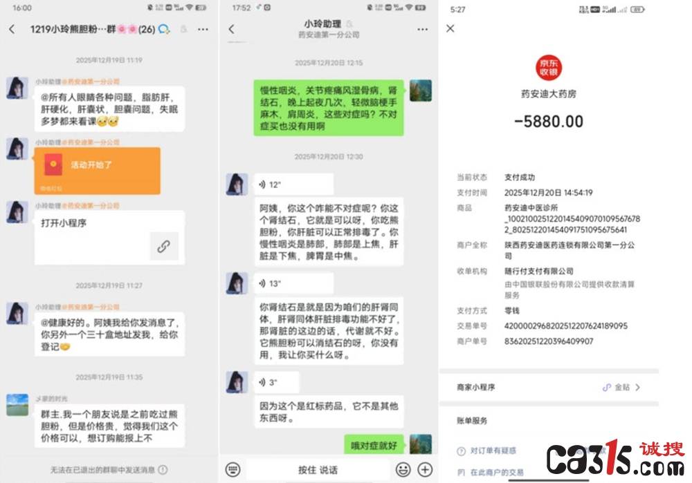 黄先生向陕西网《问政陕西》平台反映,他在企业微信、微信群及直播间里看到,一款名为“藏邑堂熊胆粉”的药品被宣传可治愈风湿骨病、肾结石、糖尿病等10余种疾病。他询问客服慢性咽炎、关节疼痛、风湿骨病、肾结石、肩周炎是否对症,客服回复“肾结石吃了熊胆粉,肝脏就可以正常排毒,5个月就能见疗效”。在客服“仅剩500盒、已抢200多盒”的诱导下,黄先生支付5880元购买了130盒。
