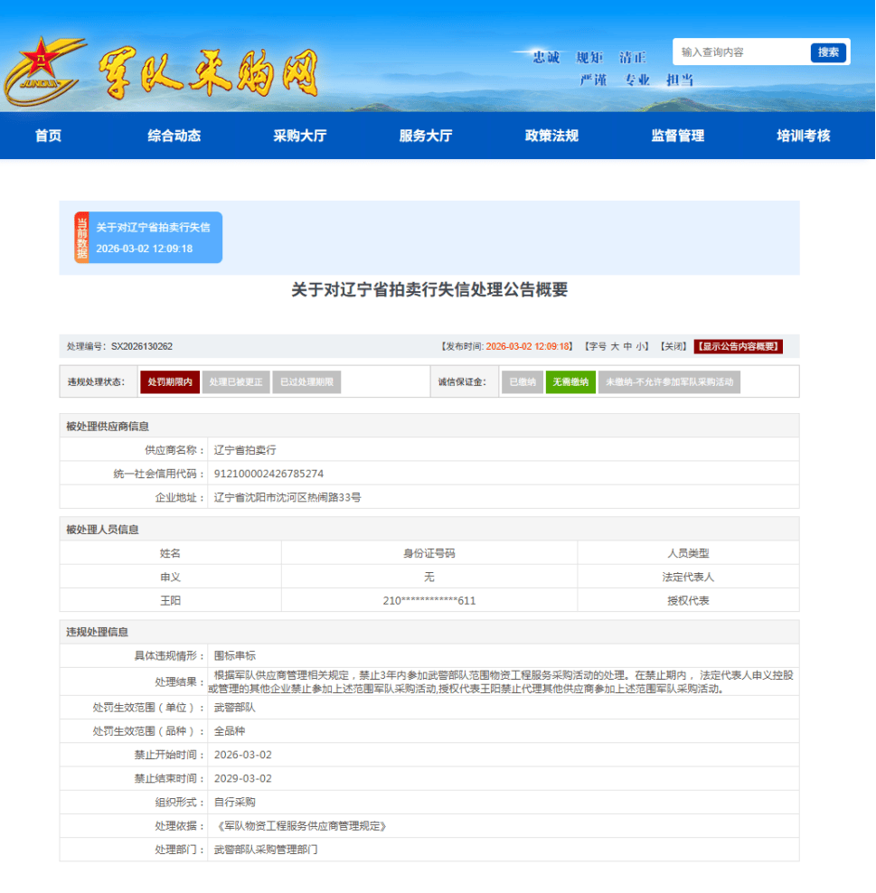 《关于对辽宁省拍卖行失信处理公告》(处理编号:SX2026130262)显示,经调查核实,辽宁省拍卖行在参加项目编号:LNTH2020566E采购活动中,存在围标串标等违规行为。根据军队供应商管理相关规定,2026年3月2日起禁止3年内参加武警部队范围物资工程服务采购活动的处罚。