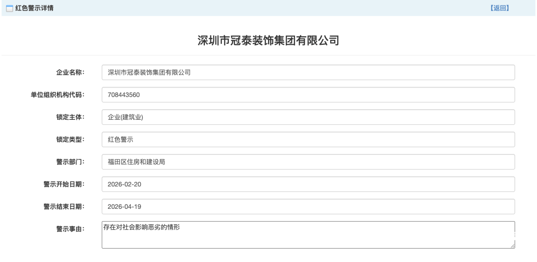 据深圳市住房和建设局官网公开信息,深圳市冠泰装饰集团有限公司被福田区住房和建设局列入红色警示名单,警示事由为“存在对社会影响恶劣的情形”,警示自2026年2月20日起至2026年4月19日止。