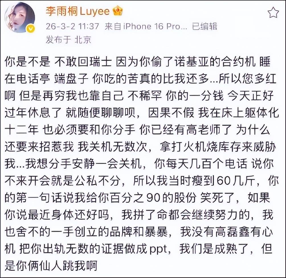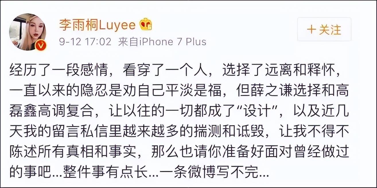 当天,李雨桐通过个人账号连发二十余条“爆料”微博,公开喊话薛之谦,称要“公开所有的真相”,并提及“归还手表、西装等物品”。她一度在评论区留言“君子报仇,十年不晚”,但随后又发文否认蹭薛之谦流量。目前,部分相关博文已被删除。