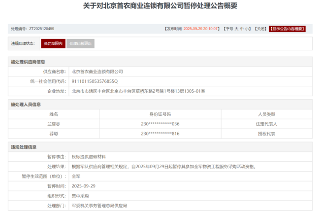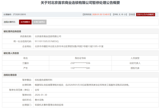 值得注意的是,与三元股份同属首农食品集团旗下的北京首农商业连锁有限公司,也因同一事由一并被暂停军采资格,暴露出集团层面在供应链与招投标管理上的系统性漏洞。