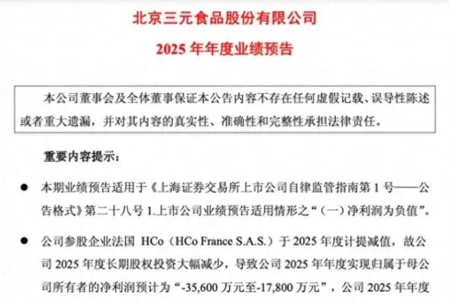 受市场需求下滑、外部竞争加剧等不利因素影响,法国HCo预计于2025年度计提商誉减值,导致三元股份长期股权投资账面价值预计减少4.96亿元至6.16亿元,直接拖累了公司整体业绩。