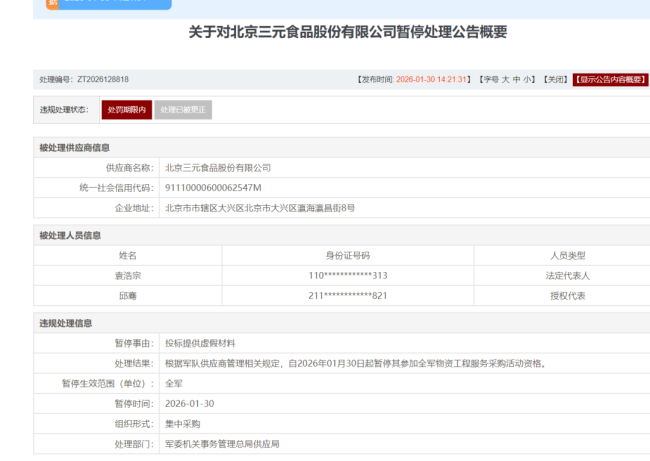 依据军队供应商管理相关规定,军委机关事务管理总局供应局决定,自2026年1月30日公告发布之日起,暂停三元股份参加全军所有物资、工程、服务采购活动的资格,处罚范围覆盖全军集中采购全场景。