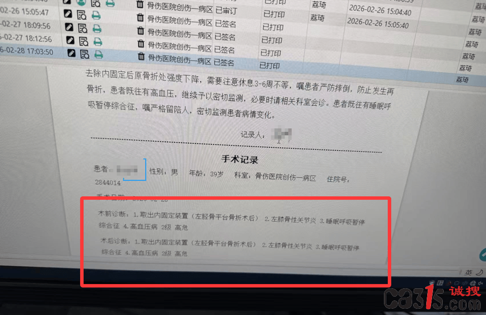 “张妮妮”告诉315诚搜网,她的丈夫这次住院就是为了取出一年前腿部骨折手术留下的两块钢板,属于常规手术。2月28日手术之前一切正常,谁也没想到第二天就出了事。“3月1日上午心跳呼吸停止,医生抢救后人就没醒过来,现在已经是脑死亡状态。”她告诉315诚搜网,家里上有老下有小,孩子才9岁,顶梁柱就这么倒下了,一家人都快崩溃了。
