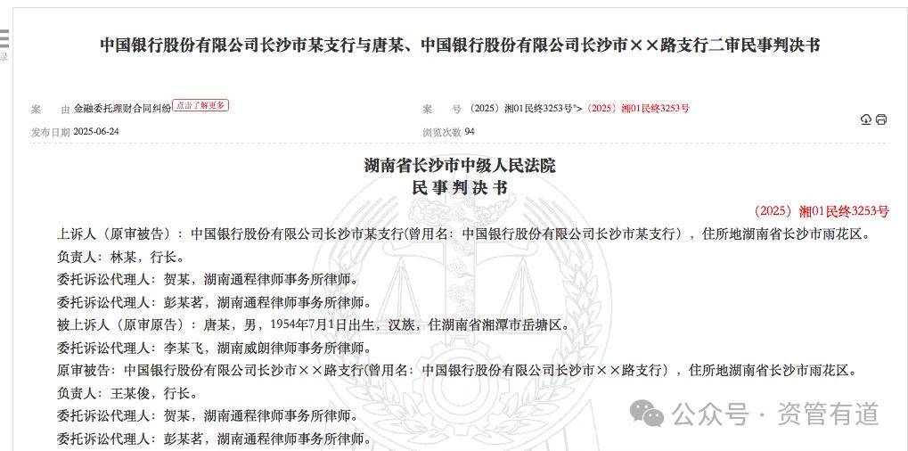 2025年4月9日,长沙市中级人民法院作出终审判决,判令中国银行长沙市某支行于判决生效后十日内向唐某赔偿投资本金损失20万元,二审案件受理费由该支行全额承担。