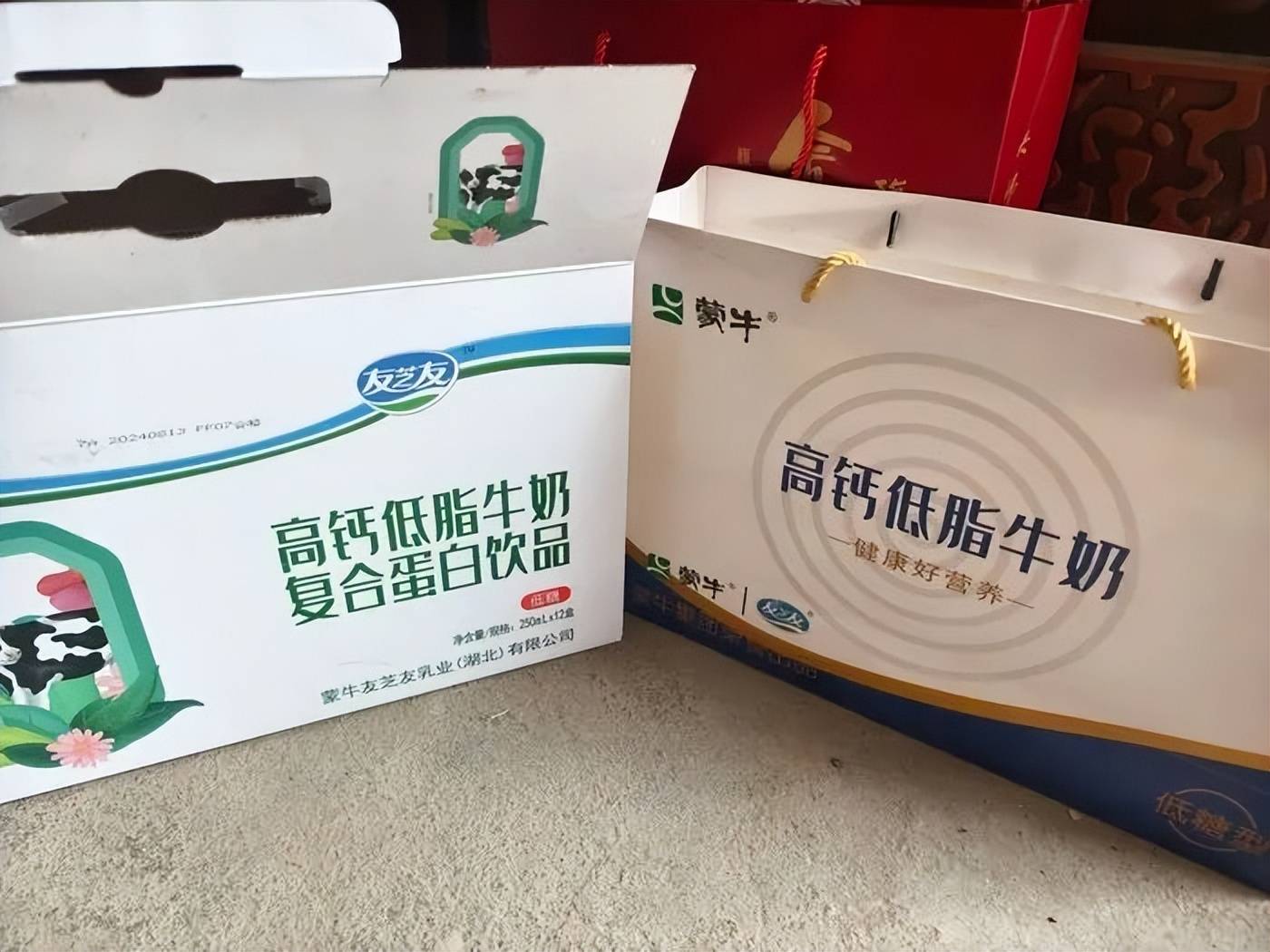 类似情况并非个案。记者调查发现,市面上流通的此类产品已经形成了多种包装版本。流通最广的一款采用白底绿字手提袋,左上角印有蒙牛标志,中央写着“高钙低脂牛奶”,而内盒则是友芝友的复合蛋白饮品。