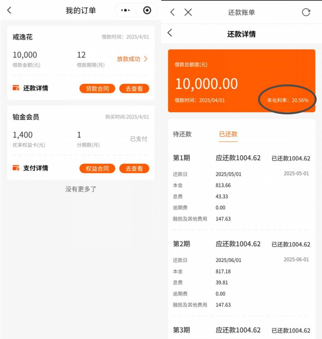 根据网友上传的还款详情截图,该笔借款分12期,第1-3期每期还款1004.62元(其中融担及其他费用147.63元),如果第4-12期还款金额保持不变,该笔借款综合年化利率为36%,如果加上1400元会员费,借款人实际承担的融资成本达65.65%。然而,“戒易花”页面标注的年化利率却只有20.56%。