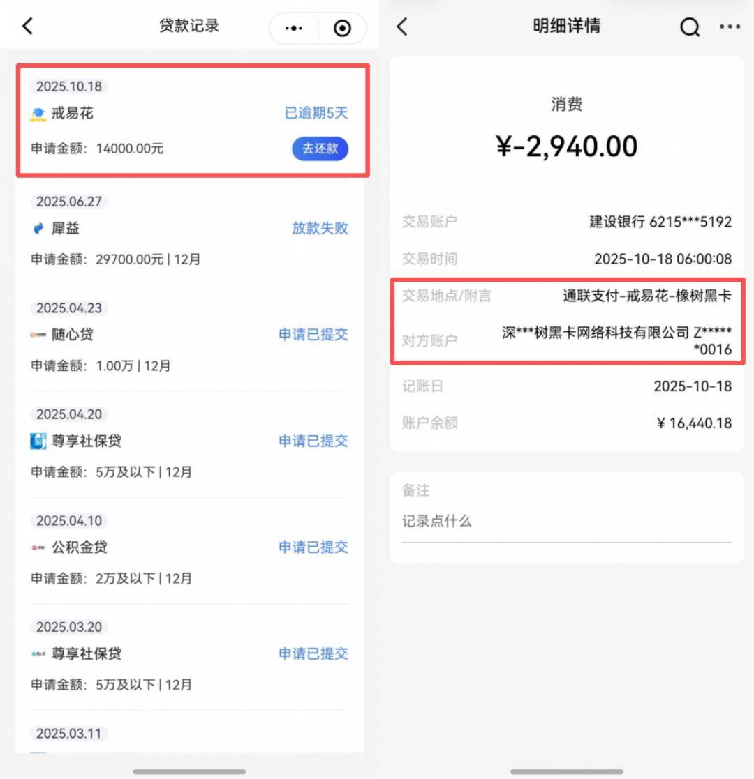 2月23日,有网友在人民网投诉反映,其2025年10月18日在XX分期合作引流的“戒易花”借款14000元,到账后被立即扣除2940元,查看后是会员费,现在查看订单页面竟显示本人不是会员,要求“戒易花”退还2940元。根据网友上传的截图,其被扣的2940元来自通联支付-戒易花-橡树黑卡。