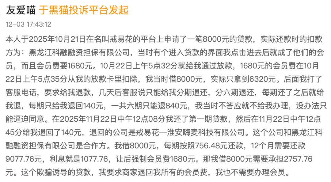 另一网友反映,其2025年10月21日在“戒易花”平台申请一笔8000元的贷款,实际还款的扣款方为黑龙江科融融资担保有限公司,当时有个进入贷款的页面,本人点进去就成了他们的会员,会员费要1680元。10月22日05:32分通过放款,1680元的会员费于当日05:35分从本人银行卡扣除,本人借款8000元,实际只拿到6320元。