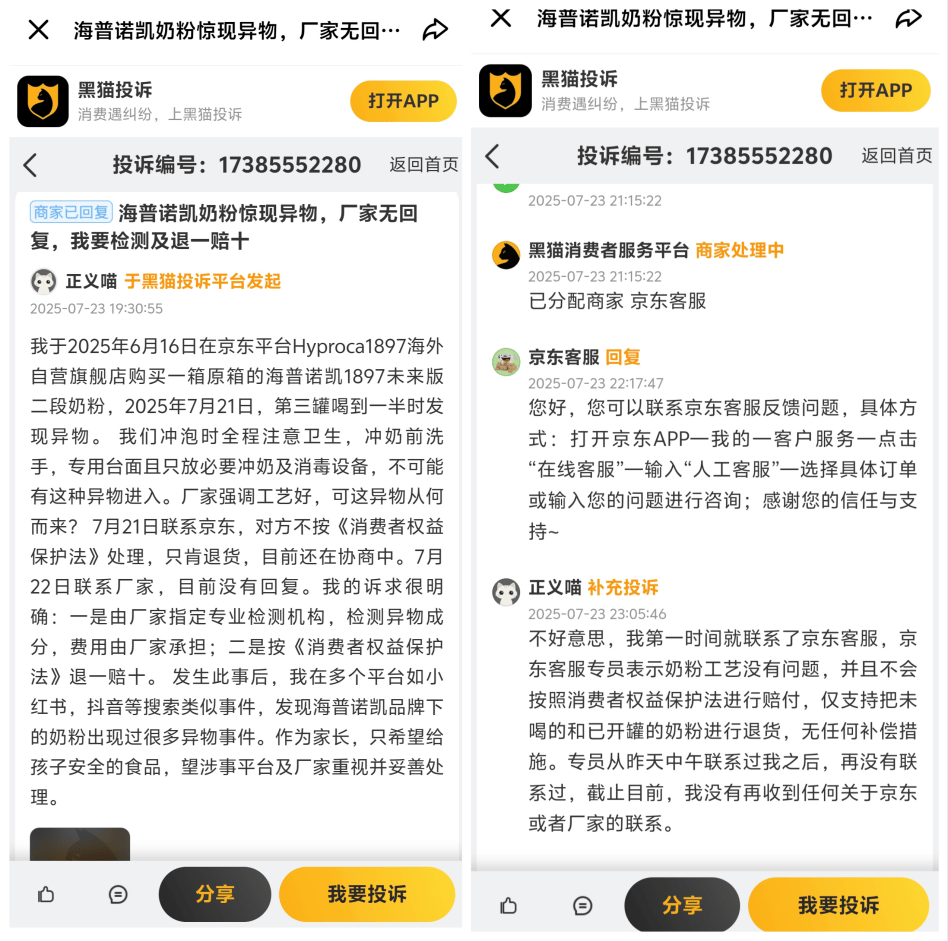 食品安全是奶粉的底线,也是最牵动家长神经的问题。2026年2月5日,有消费者通过国家市场监管总局公众留言平台反映,在线上平台购买的海普诺凯奶粉出现异物,消费者称商家拒绝赔偿。