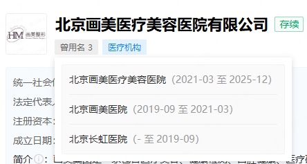 2019年,北京长虹医院更名为“北京画美医院”,两年后(2021年3月),最终定名为如今的“北京画美医疗美容医院”。画美集团在全国多地设有分院,如北京、成都、西安、深圳等城市。