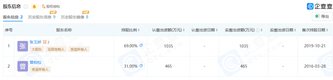 企查查显示,北京画美医美目前的法定代表人、执行董事为张玉娇,她持有公司69%的股份;另一位股东兼高管曾柏松持有剩余31%的股份。这通常被外界解读为典型的“夫妻店”式家族企业结构。