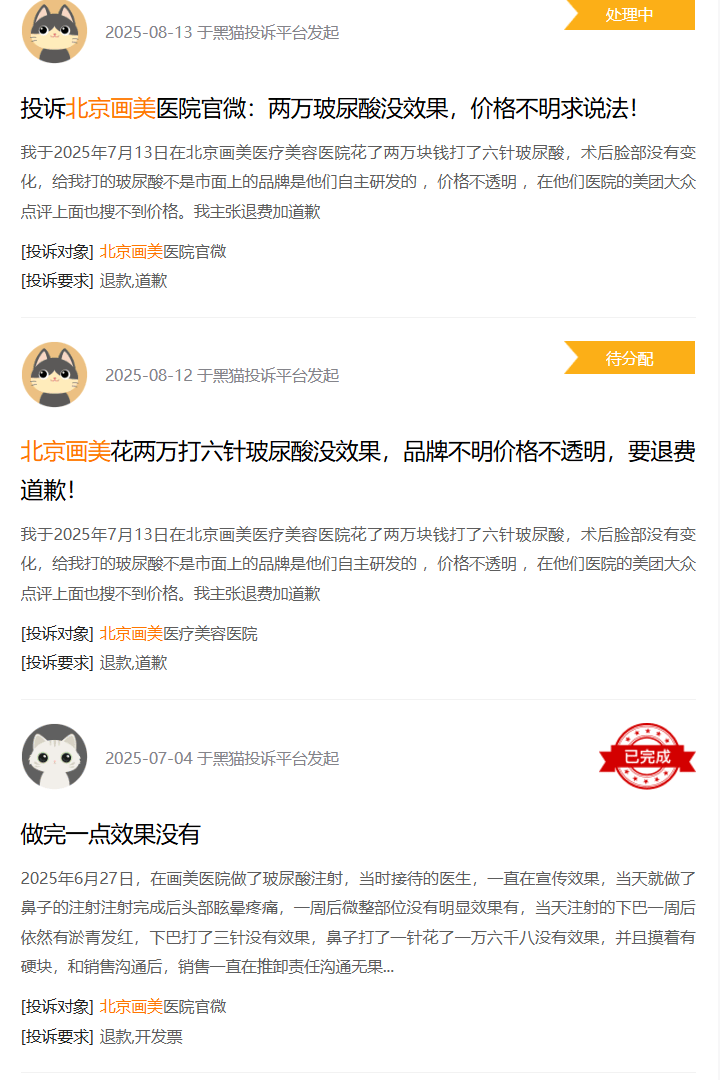 还有多位消费者表示在北京画美注射玻尿酸没效果,价格不透明。