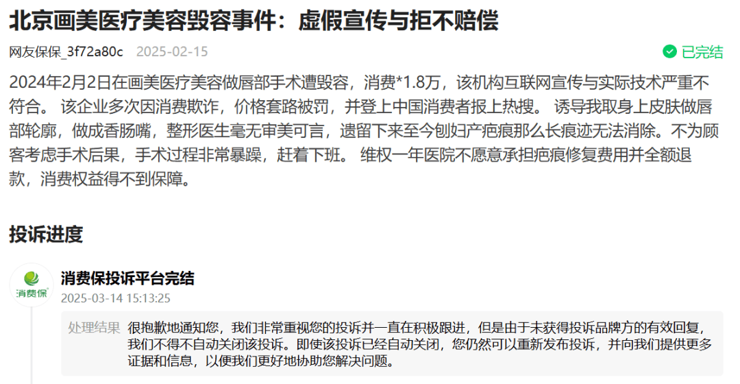 消费保平台显示,一位消费者于2024年2月2日在画美医疗美容做唇部手术遭毁容,消费1.8万。“诱导我取身上皮肤做唇部轮廓,做成香肠嘴,整形医生毫无审美可言,遗留下来至今刨妇产疤痕那么长痕迹无法消除。”
