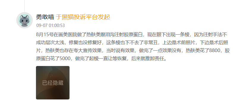 黑猫投诉2025年9月,一位用户称“在画美医院做了热肤美跟泪沟注射胶原蛋白,因为注射手法不成功层次太浅,现在眼下出现一条棱,无法修复,这条棱下不去了。上边是术前照片,下边是术后照片,热肤美也存在夸大宣传效果,当时说有效果,做完了一点效果没有,热肤美花了8800,胶原蛋白花了5000,做完了起棱一直让等恢复,后来就推卸责任。”