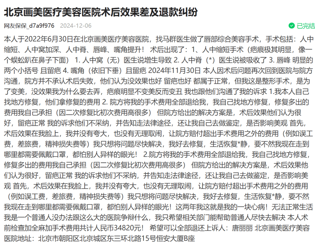 唐某在消费保表示,其于2022年6月30日在北京画美医疗美容医院由马群医生进行唇部综合美容手术,项目包括人中缩短、人中窝加深、人中脊、唇峰、嘴角提升,手术及麻醉等费用共计34820元。术后出现明显问题:人中缩短处疤痕明显如蜈蚣状;人中窝未显现,医生称系增生导致;人中脊消失,医生称被吸收;唇峰留疤且形态不佳;嘴角仍下垂并留疤。2024年11月30日唐某与院方沟通,院方却不承认手术失败,认为效果正常、留疤属正常,拒绝退款或承担责任。