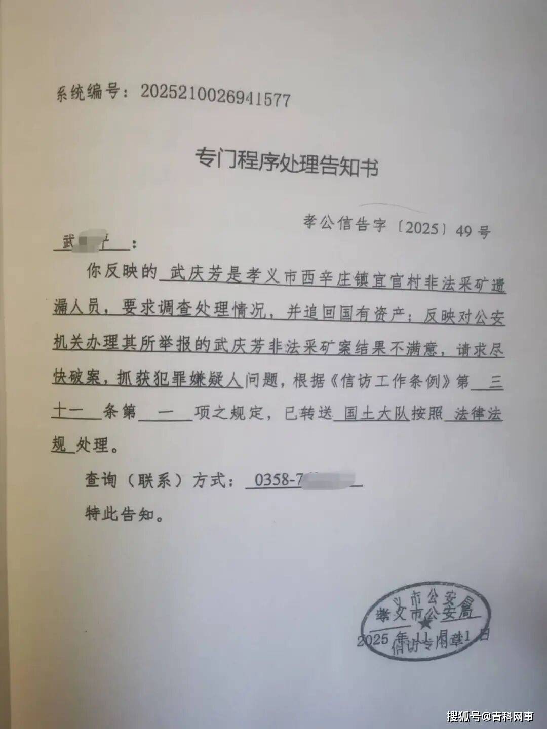 2025年11月11日,孝义市公安局向举报人武某平出具了《专门程序处理告知书》,称武某平反映的问题已转送国土大队按照法律程序处理。