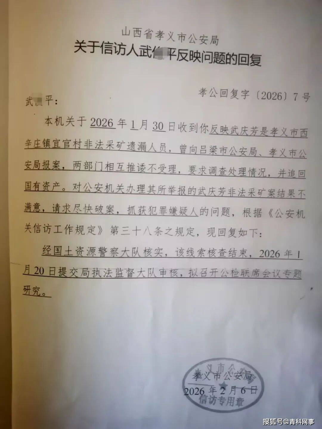 时隔三天后,孝义市公安局书面回复武某平,“经国土资源大队核实,该线索核查结束,2026年1月20日提交局执法监督大队审核,拟召开公检联席会议专题研究。”