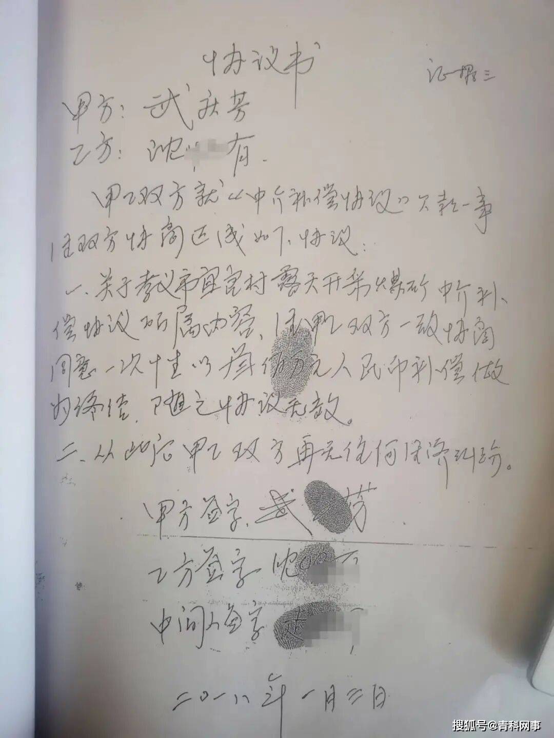 2018年1月3日,武庆芳与沈某有再次签订了一份《协议书》,协议书明确载明,“关于孝义市宜官村露天开采煤矿中介补偿协议所属内容,经双方一致协商同意一次性以三百万人民币补偿作为终结,随之协议无效。”